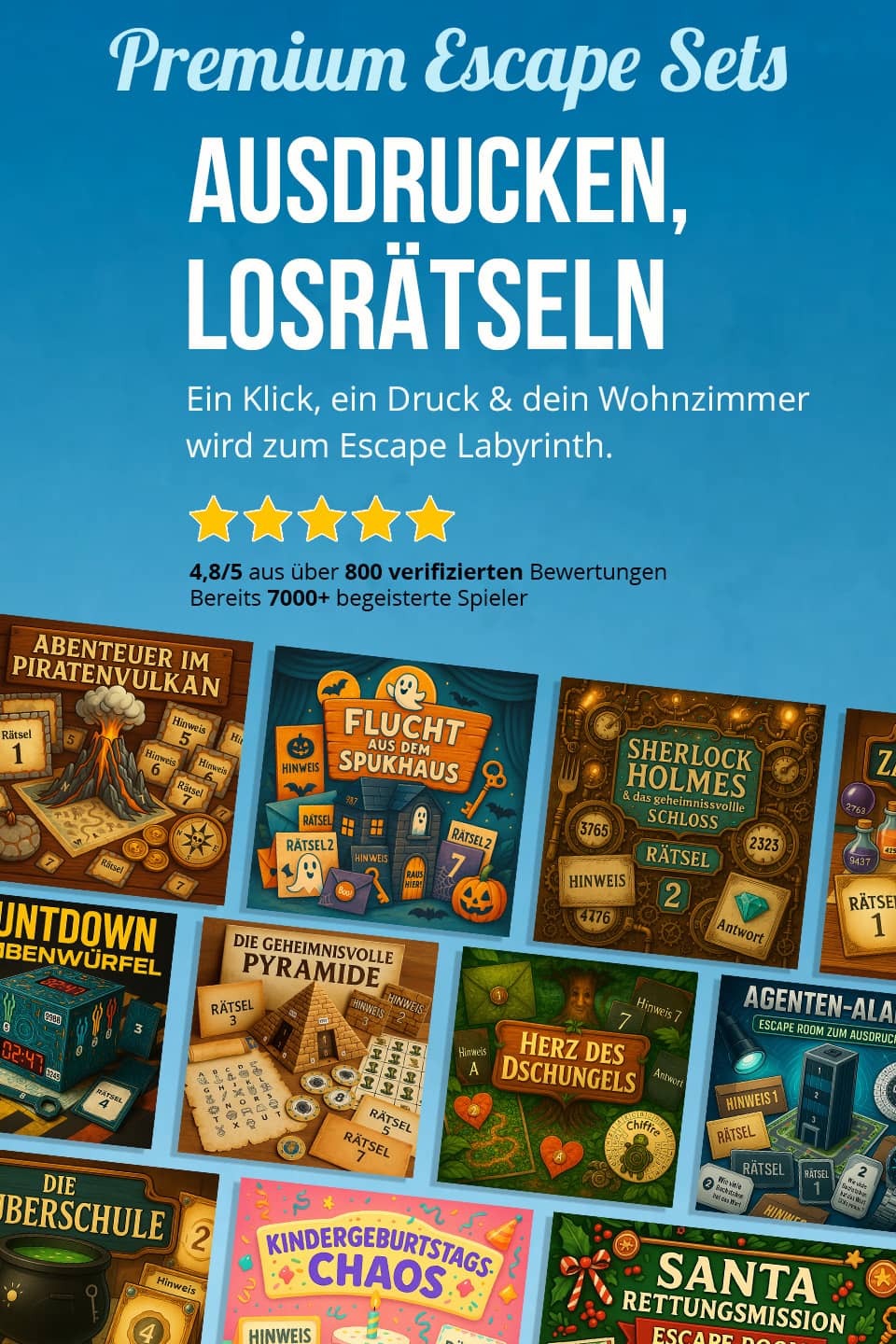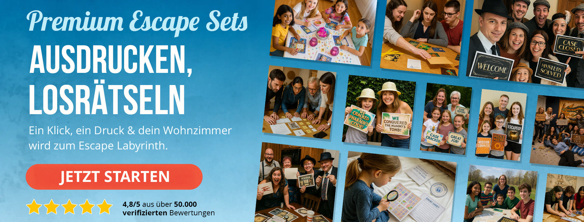 Unsere Sets funktionieren ab 1 bis 12 Spielern. Empfohlenes Mindestalter ist 10 Jahre; mit etwas Hilfe haben aber schon Achtjährige Spaß. Durch die Hinweisekarten passt sich der Schwierigkeitsgrad flexibel an gemischte Gruppen an.