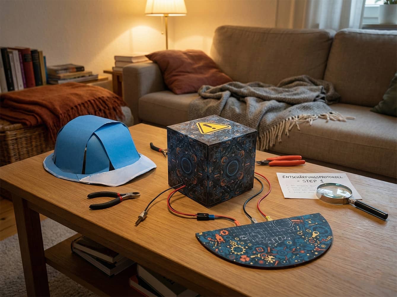Die reine Rätselzeit liegt bei circa 60 Minuten. Rechne zusätzlich 15–20 Minuten für den Aufbau. Wer alle Hinweise nutzt, kann auch schneller durch sein; ohne Tipps dauert es etwas länger – perfekt für einen spannenden Abend.